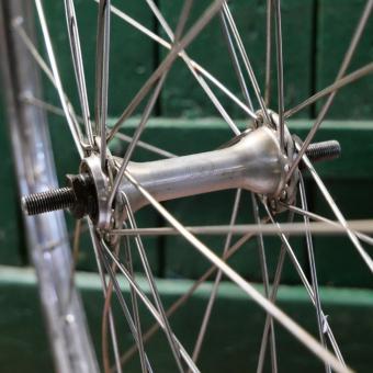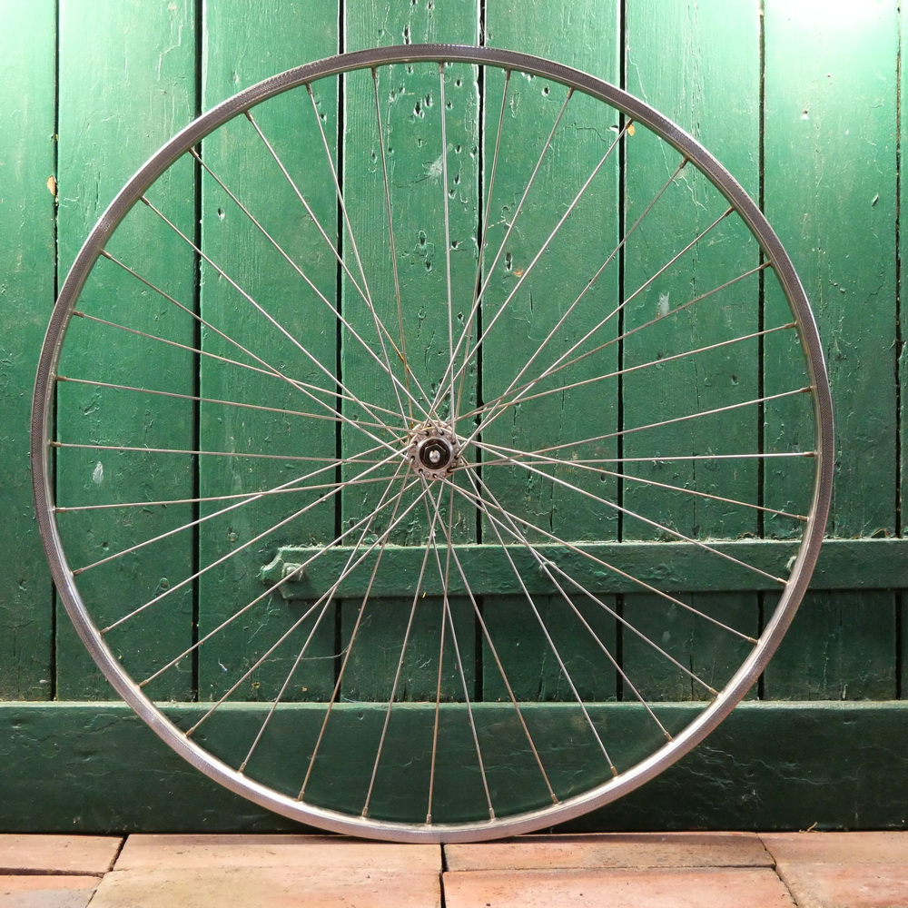 Vorderrad 28 Zoll (622), 1980er/90er J., Felge: Weinmann, Niro, Breite ca. 27 mm, 36-Loch, Nabe: Mailard, Aluminium, Einbaumaß ca. 96 mm, 2mm Speichen Niro, gebraucht mit Patina, Zustand gemäß Fotos