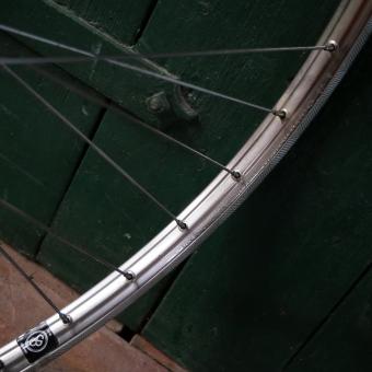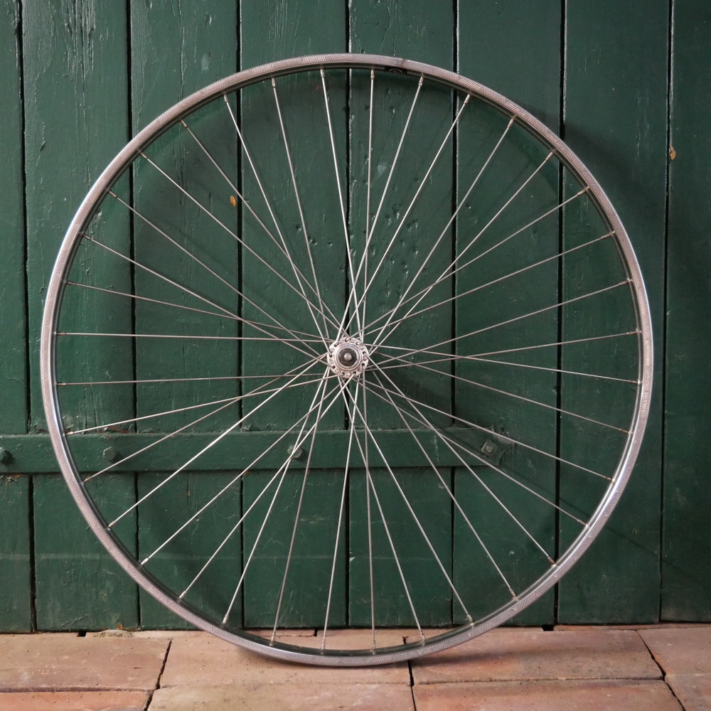 Vorderrad, 28 Zoll (622mm), Bj. 1986, VAN SCHOTHORST Niro-Felge, Breite ca. 28mm, MAILLARD Alu-Nabe, Einbaumaß ca. 96mm, 2mm Niro-Speichen, alte Neuware mit leichten Lagerungsspuren, Zustand gemäß Fotos