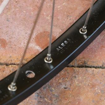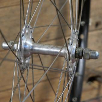Vorderrad mit ALESA Konkav-Felge, Alu, schwarz, 28 Zoll (622), 80er J., Breite ca. 25 mm, Nabe WECO Hochflansch, Einbaumaß ca. 100 mm, 36 Loch, 2 mm Speichen nirosta, leicht gebraucht mit schöner Patina, Zustand gemäß Fotos