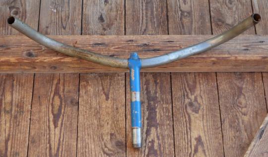Fahrradlenker für Innenbremse, original 10er/20er Jahre, vernickelt, für Tourenrad, Durchmesser Lenkrohr und Schaft 22,2 mm, Breite ca. 530 mm, Schaftlänge ca. 160 mm, Loch für Bremsgestänge 6,5 mm, gebraucht mit schöner Patina, Nickel unter Lack gut,
