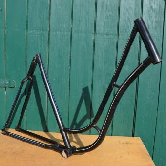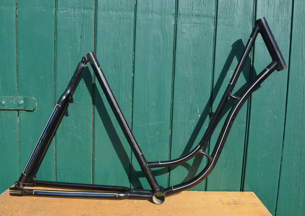 Fahrradrahmen Damenrad 28 Zoll, Fabrikat unbekannt. Vor Jahrzehnten neu lackiert und handliniert, Vorkriegsmodell, Rahmenhöhe 56 cm, Linierung blau-weiß, Sonderpreis!