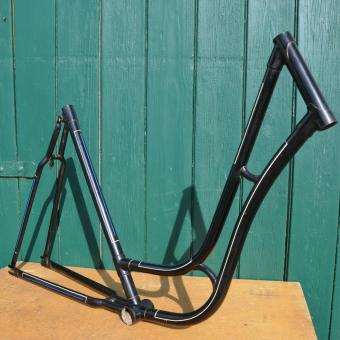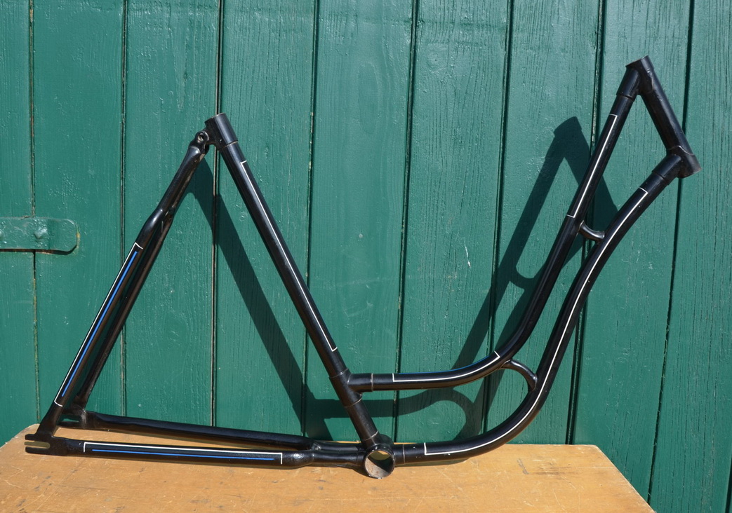Fahrradrahmen Damenrad 28 Zoll, Fabrikat unbekannt. Vor Jahrzehnten neu lackiert und handliniert, Nachkriegsmodell, Rahmenhöhe 55 cm, Linierung blau-weiß. Sonderpreis!