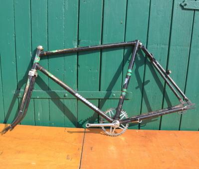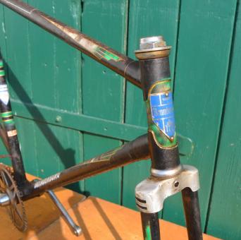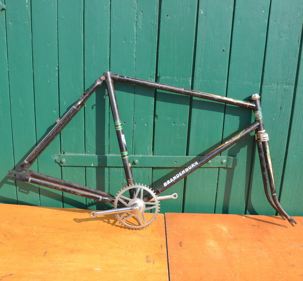 Fahrradrahmen Herrenausführung "Brandenburg" 28 Zoll, schwarz, Linierung grün/gold, Rahmenhöhe 55 cm, 50er Jahre mit Glockentretlager