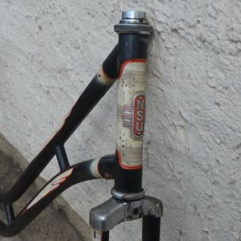 Fahrradrahmen "NSU" Damenausf., Flügellinierung, 28 Zoll, Stahl, RH=54 cm, 60er Jahre. Tretlager hat leichtes Spiel. Ideal zum Aufbau eines Klassikrades nach eigenen Wünschen und Vorstellungen.