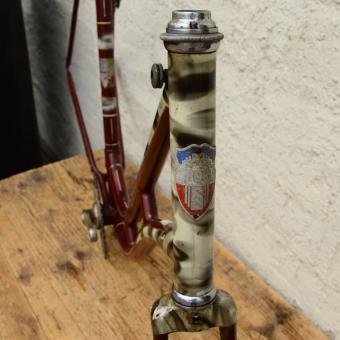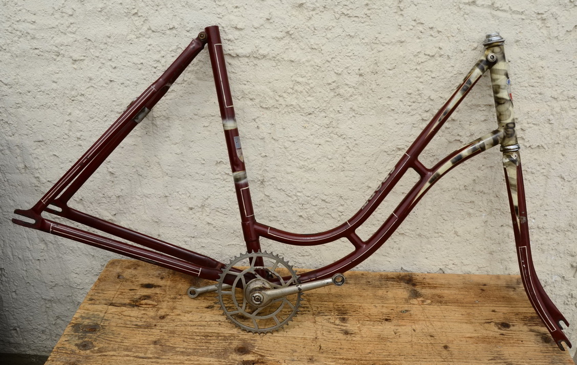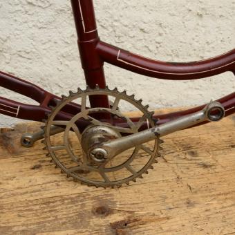 Fahrradrahmen "Sport", 28 Zoll Damenausführung, Gabel, Tretlager und Schloß, weinrot, Strahlenkopf. 20er Jahre, Tretlager vernickelt, Rahmenhöhe 55 cm, Rahmennummer 9XXX. In 50er Jahren umgelabelt auf Marke Sport, ursprünglich Hersteller unbekannt, mit Bandfeststeller