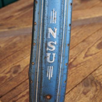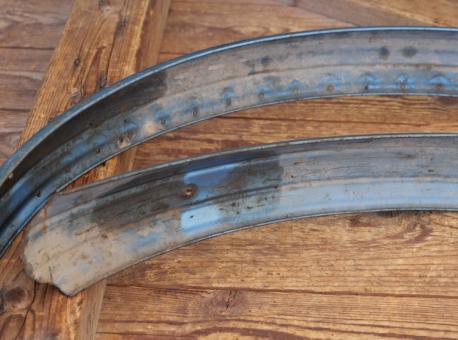 Schutzbleche Satz NSU, 28 Zoll, Damenausführung, 50er J., blau-metallic, Linien weiß/gold, Breite 60 mm, gebraucht mit schöner Patina, Zustand gemäß Fotos.
