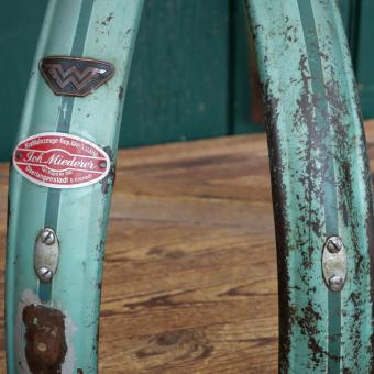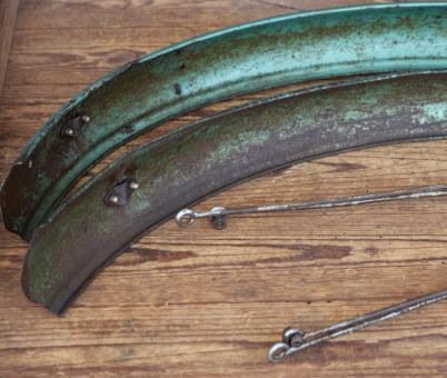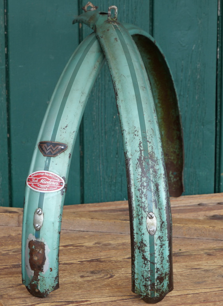 Schutzbleche Satz WANDERER, 26 Zoll, Herrenausführung, 50er J., lindgrün, Linien dunkelgrün/weiß, Breite ca. 60 mm, inkl. Originalstreben, gebraucht mit Patina, ein kleiner, seitlicher Riss hinten, Zustand gemäß Fotos.