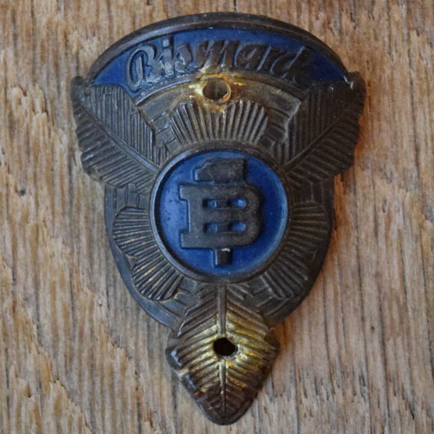 Steuerkopfschild BISMARCK, 50er Jahre, Originalschild aus Sammlungsbestand, Lochabstand 32 mm Ideal für den passenden Fahrradoldtimer oder die Sammlervitrine. Zustand siehe Bild.