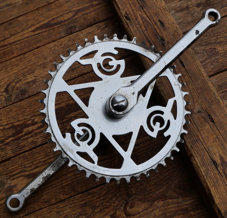 Tretlager GÖRICKE, für Tourenrad, orig. 50er/60er Jahre, verchromt, Glockenlager, Kettenblatt 46 Zähne, Kurbellänge 170 mm, Durchmesser Lagerschalen 40 mm, gebraucht mit Patina, Zustand siehe Bilder.
