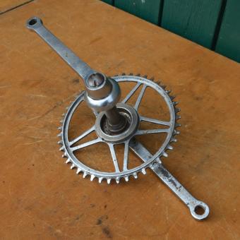 Tretlager Glockenausführung für 40x70 mm Tretlagergehäuse, 50er Jahre. Hinweis zum Zustand: Die Tretlager sind unrestauriert, in der Substanz aber ok. Optik und Zustand der Zähne, siehe Bilder. Die Konen und Lager müssen, soweit überhaupt dabei und je nach Anspruch an den technischen Zustand, ggf. überholt/ergänzt oder ausgetauscht werden. Ersatzteile können wir für viele Typen gegen Berechnung liefern.
