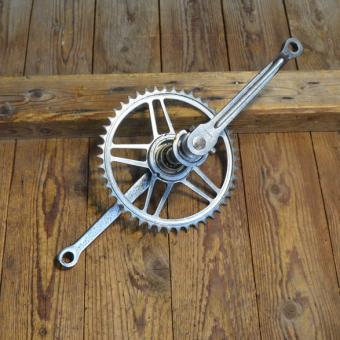 Tretlager Keilausführung "Dürkopp", 50er Jahre mit Einschraubschalen, Achslänge 133 mm, Kurbellänge 177 mm.