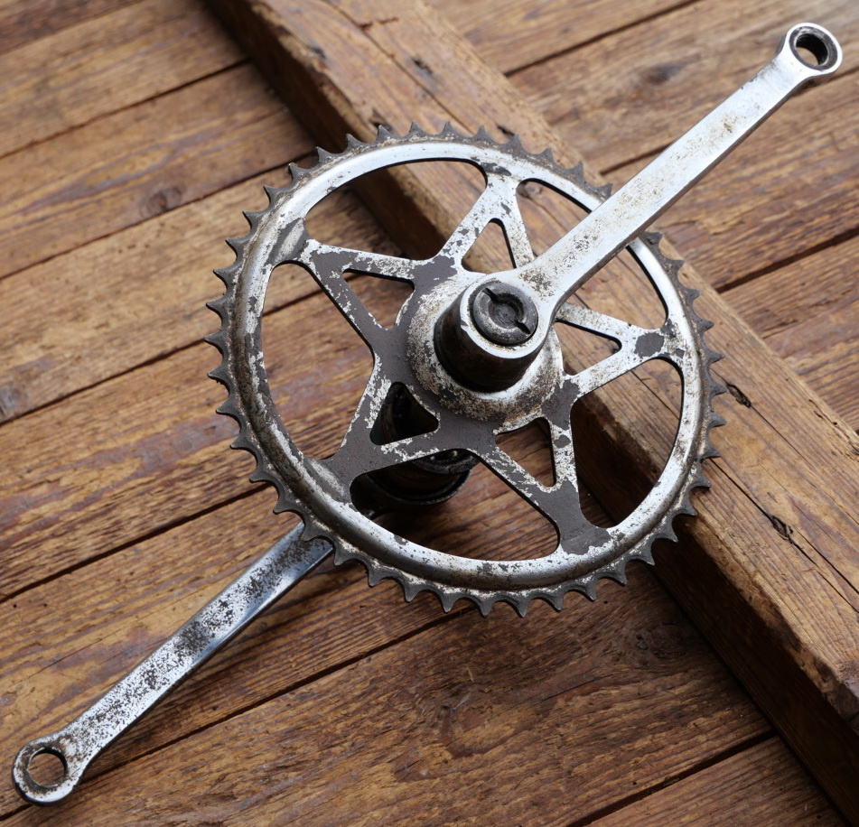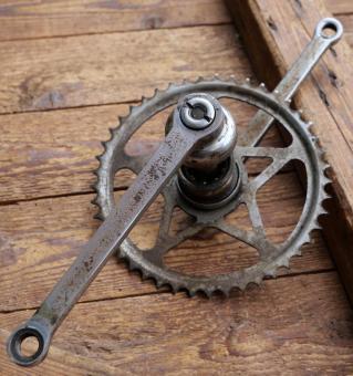 Tretlager NSU, für Tourenrad, orig. 40er/50er Jahre, verchromt, Glockenlager, Kettenblatt 45 Zähne, Kurbellänge 175 mm, Durchmesser Lagerschalen 40 mm, gebraucht, Zustand siehe Bilder.