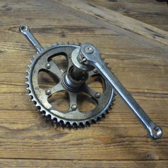 Tretlager "Thun" Keilausführung, Doppeltes Kettenrad (für Tandem hinten), Kurbellänge 170 mm, Achslänge 150 mm Hinweis zum Zustand: Die Tretlager sind unrestauriert, in der Substanz aber ok. Optik und Zustand der Zähne, siehe Bilder. Die Konen und La