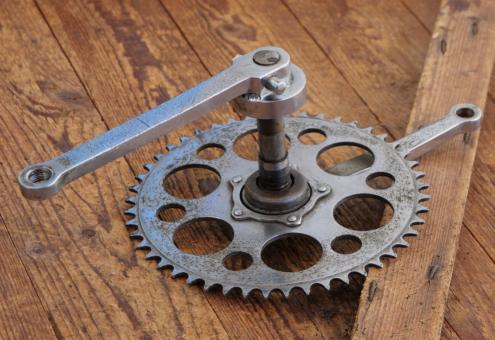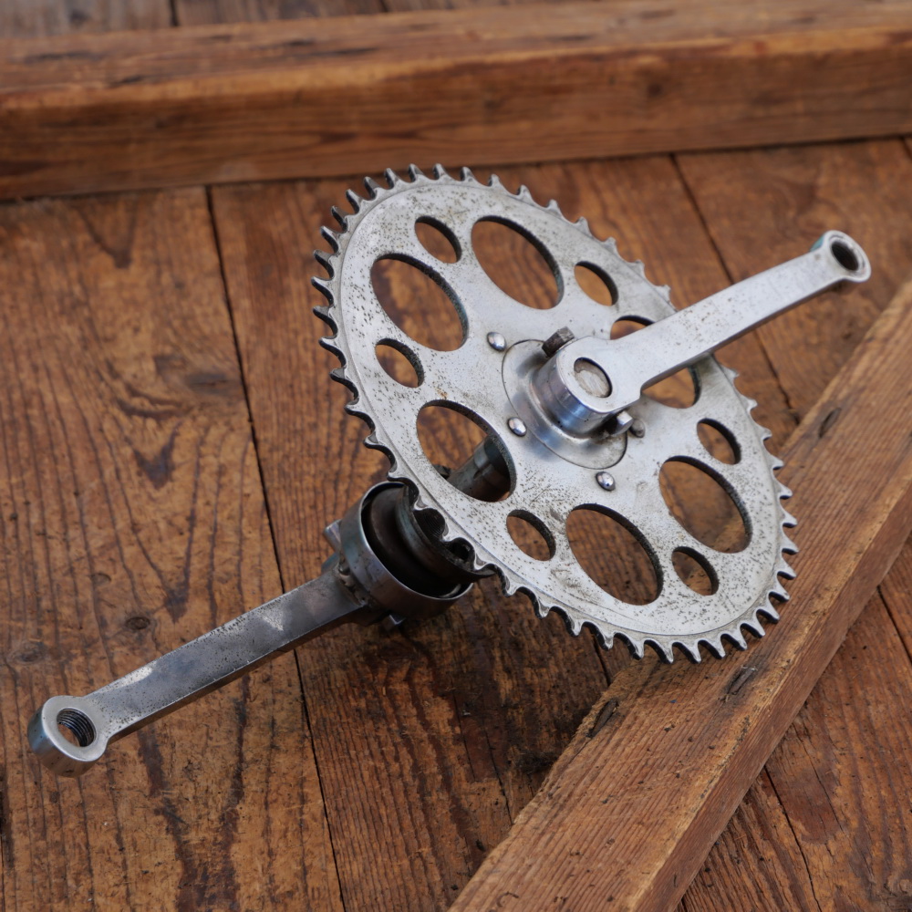 Kettenblatt 48 Zähne, Kurbellänge 170 mm, ca. 50 Jahre alte Neuverchromung (war einst ab Werk vernickelt) , Glocke links repariert, Zustand