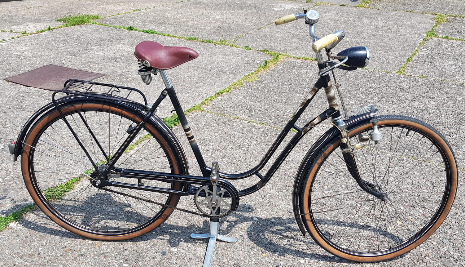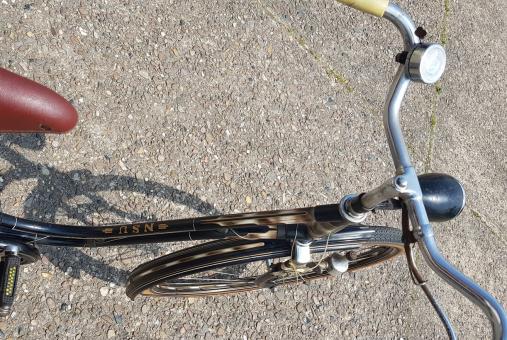 Damenfahrrad "NSU", 28 Zoll, Bj. 50er Jahre, RNr. 8357XX RH: 53,5cm, viele NSU gemarkte Teile (Glocke, Kettenschutz etc.). Schöner Sonntagsklassiker, Zustand siehe Bilder.