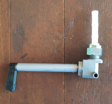 Benzinhahn M12 x 1 links, Abgang rechts , Stutzen 6mm, mit Reserve, Hebellänge 65 mm (verstiftet und leicht einkürzbar). Gut einsetzbar bei Mopeds mit Blechverkleidungen, bei denen der Hahn von außen zugänglich ist.