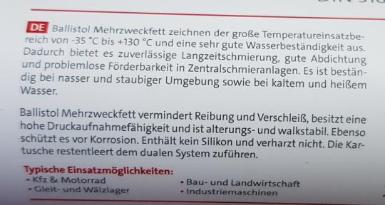 Ballistol Universalfett ist bei Temperaturen von -30°C bis +120°C stabil und wasserbeständig. Ballistol Universalfett ist besonders zuverlässig, wenn eine Langzeitschmierung und sehr gute Abdichtungseigenschaften erforderlich sind.