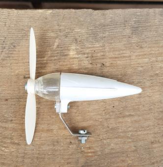 Schutzblechfigur in Torpedoform, orig. 60-70er Jahre, perlmuttweiß, , Kunststoff, mit drehbarem, großen Propeller, orig. Altbestand NOS. Montage auf dem vorderen Schutzblech (Propeller muß größenbedingt überstehen) oder wahlweise anderswo am Fahrrad oder Moped.