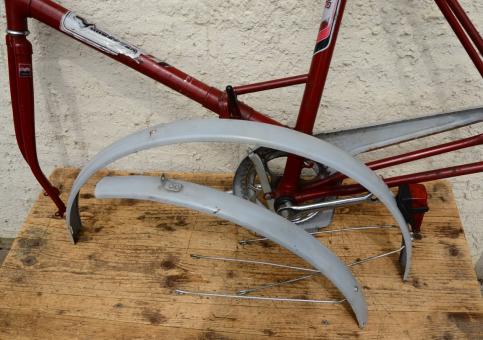 Fahrradrahmen: Seltenes 28 Zoll Klapprad aus russischer Produktion (gefahren in der DDR) , weinrot mit Spezial-Gepäckträger und Schutzblechsatz, 70er Jahre, mit Patina. Rahmenhöhe 56,5 cm. Siehe Bilder.