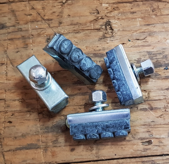 Bremsklötze für Sport und Tourenradklassiker, orig. Satz 4 Stück, kompl. Gummi mit Schuh und Hutmutter gem. Bild.