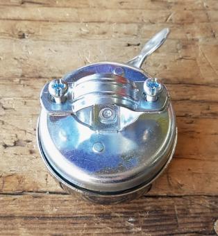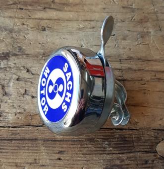 Moped Motorfahrrad Glocke / Klingel "SACHS" klassische Glocke mit blauem Sachs Logo , verchromter Deckel, Unterteil verzinkt mit Metalldrücker, Neuauflage. Ideal für alle Fahrzeuge mit Sachs-Motor !