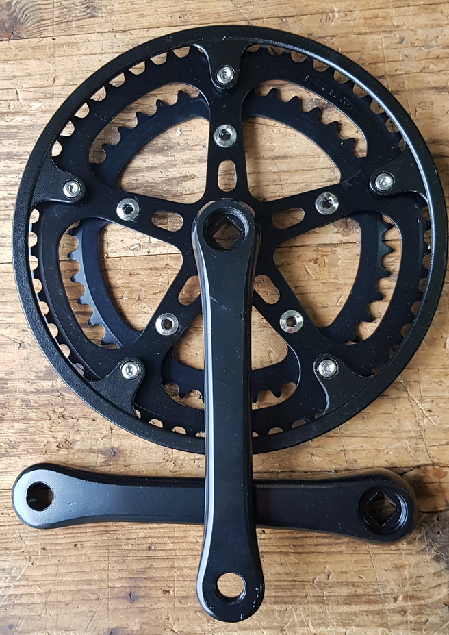 Kurbelgarnitur 2-fach, "SUGINO (Japan) ", schwarz, für Tretlager mit Vierkantachse, Kurbel 170 mm, Kettenblatt 52/42 Zähne, LK: 110 mm, Pedalgewinde standard 9/16". Kurbeln, Kettenräder und Kettenschutzring aus stabilem Aluminium,