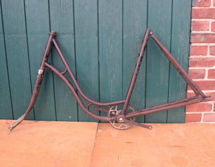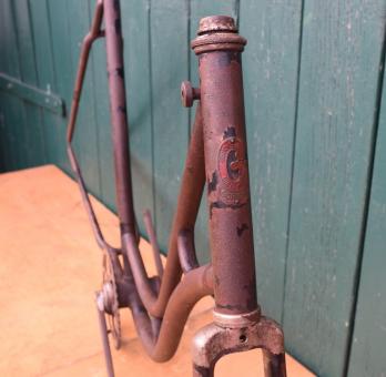 Fahrradrahmen "Göricke", Damenausführung 28 Zoll mit starker Patina. Rahmenhöhe 54,5 cm, Rahmennummer 628XXX, Mit Gabel, Steuerkopfschild und Bandfeststeller, 20er Jahre