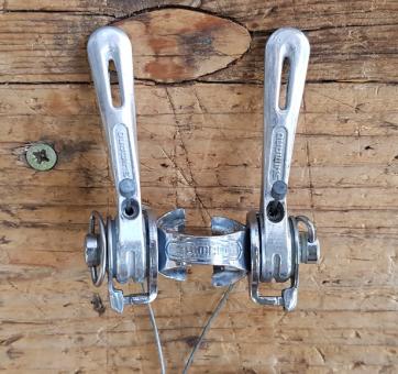Schalthebel Komplett Satz "SHIMANO" für Unterrohrmontage, Aluminium, 70/80er Jahre, NOS, incl. Zügen. Hochwertige Ausführung. Ideal für Rennradklassiker mit ungerasterten Schaltwerken der 70er Jahre.
